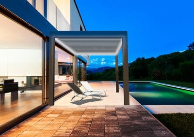 La pergola bioclimatique grâce à ses lames orientables, protège du soleil, de la pluie et optimise la circulation de l’air pour votre bien-être. Prolongez vos moments de vie en soirée grâce aux éclairages LED intégrés pilotables par télécommande.