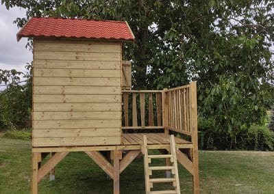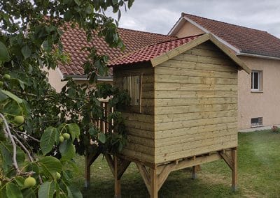 Nous avons réalisé sur mesures une cabane sur pilotis en pin autoclave destinée à des enfants.