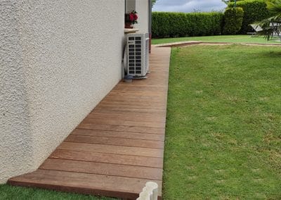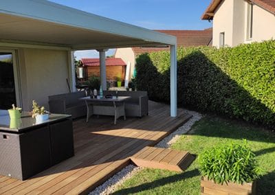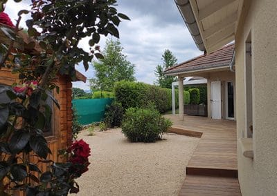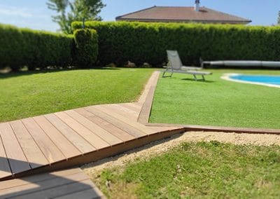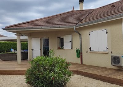 Nous avons proposé de réaliser une terrasse en bois exotique sur plots réglables ce qui a permis de surélever la terrasse pour la mettre au niveau du seuil de la baie vitrée. Nous avons pu créer une nouvelle rampe d’accès vers la piscine. Le projet fini à permis d’apporter une nouvelle ambiance chaleureuse, une cohérence visuelle et un joli cachet à cette maison.